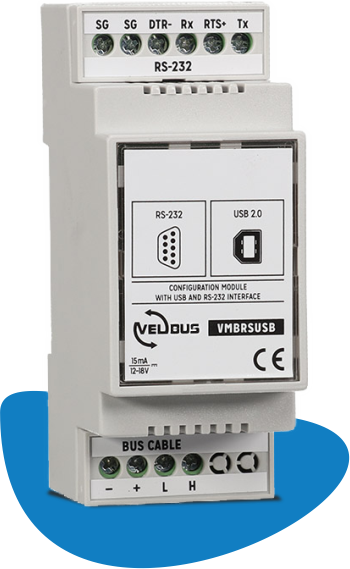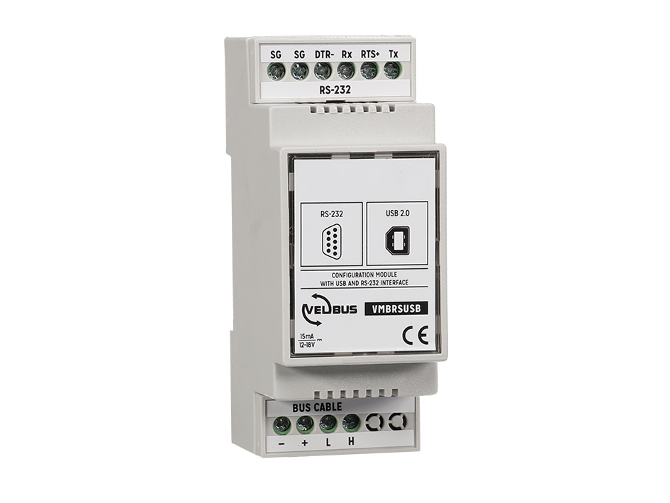 You can use the configuration modules to configure and program the velbus system with your computer. USB port for easy connection, RS-232 port for long connections or for creating your own applications. You can download the communication protocol for all velbus modules for free.